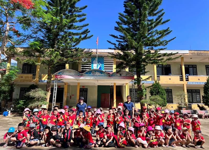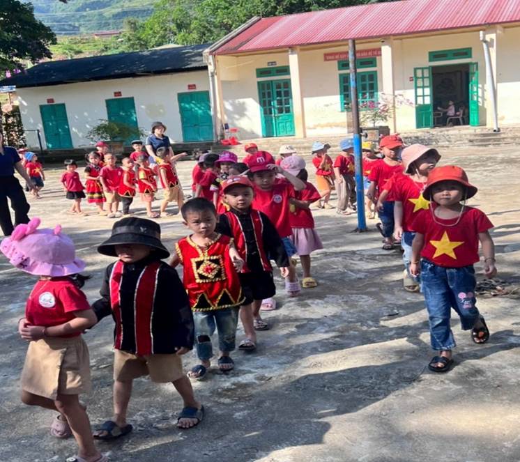 ( Hình ảnh các bạn 5 tuổi điểm trường Huổi Cang đóng vai học sinh lớp 1)