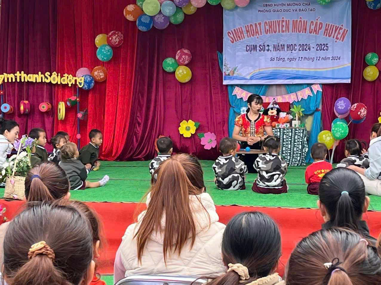 Thực hiện kế hoạch số 947/PGDĐT-CMMN ngày 08 tháng 10 năm 2024 của phòng giáo dục và đào tạo về kế hoạch tổ chức sinh hoạt chuyên môn cấp mầm non năm học 2024-2025. Chiều ngày 13/12/2024 tại trường mầm non số 1 Sá Tổng cụm số 3 tổ chức dạy sinh hoạt chuyên môn với tiết dạy steam: Dự án làm bưu thiếp 22/12 do cô và trò trường Mầm non Sá Tổng 2 thực hiện và tiết dạy nhận biết, phân biệt kích thước to nhỏ do cô và trò trường mầm non số 1 Sá Tổng thực hiện. Với mục tiêu tạo điều kiện cho cán bộ giáo viên được giao lưu, học hỏi, trao đổi, chia sẻ kinh nghiệm trong việc thực hiện chương trình giáo dục mầm non nhằm nâng cao chất lượng nuôi dưỡng, chăm sóc và giáo dục trẻ, kịp thời tháo gỡ những khó khăn vướng mắc trong chuyên môn và đề xuất các giải pháp hữu hiệu nhất nhằm nâng cao chất lượng chuyên môn của nhà trường. Dưới đây là một số hình ảnh về tiết học steam: Dự án làm bưu thiếp 22/12, do cô Mào Thị Duyên giáo viên trường mầm non số 2 Sá Tổng thực hiện: