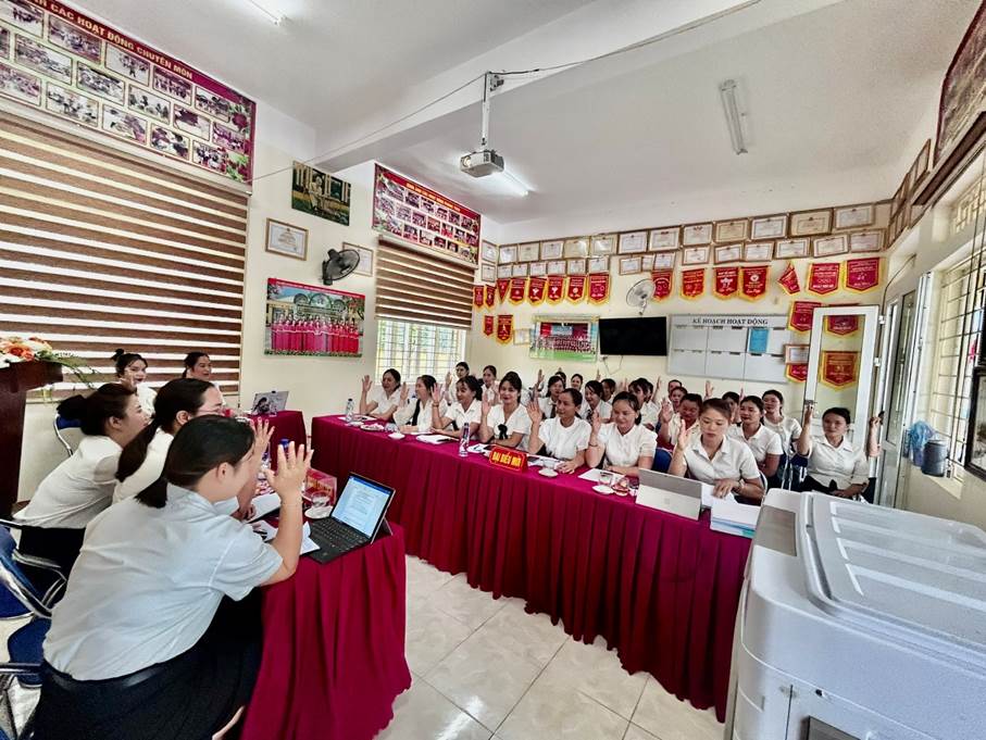 Sau buổi làm việc nghiêm túc và khẩn trương, Hội nghị đã đi đến biểu quyết thông qua các chỉ tiêu cơ bản của nhiệm vụ năm học 2025 - 2026 và thống nhất các kế hoạch, chỉ tiêu đề ra, quyết tâm thực hiện bằng biểu quyết 100% Viên chức, người lao động trong nhà trường nhất trí.