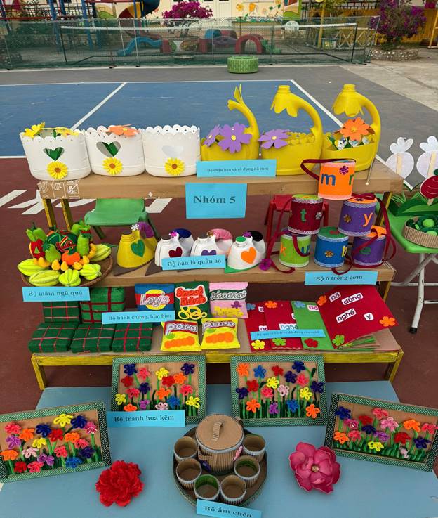 Từ những nguyên vật liệu quen thuộc, gần gũi và an toàn như bìa carton, chai nhựa, vải vụn, que gỗ…, bằng đôi bàn tay khéo léo và trái tim yêu nghề, các cô đã sáng tạo nên rất nhiều sản phẩm đồ dùng – đồ chơi sinh động, đầy màu sắc và mang giá trị giáo dục cao.